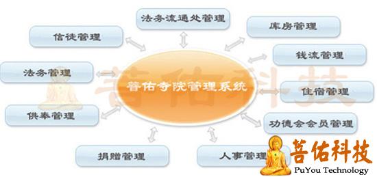 上海菩佑信息科技有限公司历时多年,探讨研究当今社会各寺院管理的困境,从理性到实务以及科学信息化的观点出发,成功研制出一套<寺院事务管理系统>,包括信众管理,佛事管理,法会管理,牌位管理,佛像管理,捐赠管理,皈依弟子管理,常住挂单僧人管理,职工管理,义工管理,档案管理,财务钱流管理,住宿/客房管理, 功德会会员管理,慈善管理,素斋馆管理,牌位/佛像智能化管理,牌位/佛像点灯寻灯管理,网站信息化,库房管理和法务流通处管理等并成功应用于几十家寺庙中,在此期望能让更多寺院的事务活动在寺院事务管理委员会的领导下,能有更加合理、简单便捷、快速高效的管理。